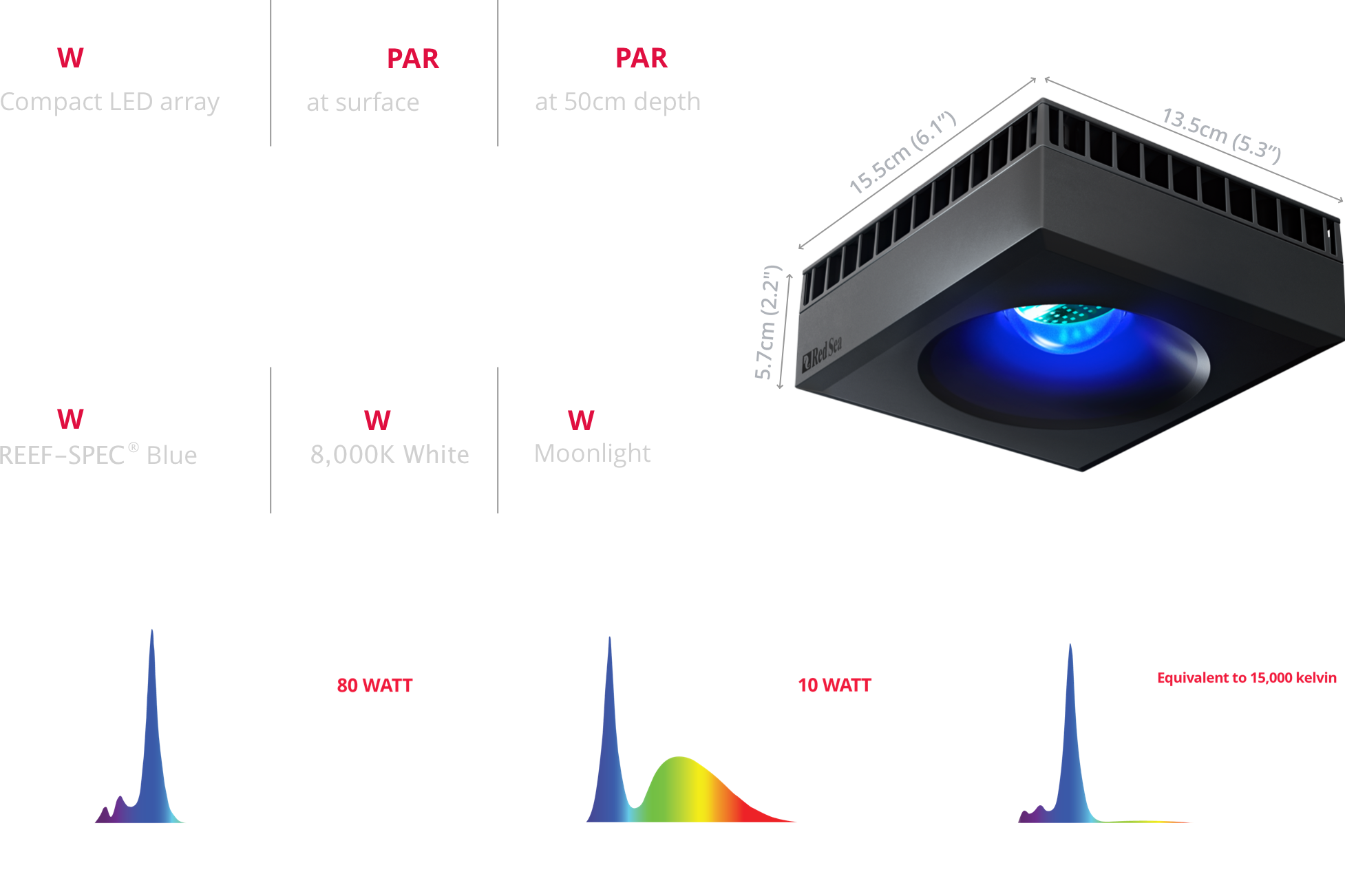 At the heart of the unit is a single, compact LED array that includes a multi-wavelength, 23,000 Kelvin “REEF-SPEC Blue” channel (a proprietary blend of blue, violet and ultraviolet LEDs) which, together with an 8,000K White channel, provides a reef-safe range of color temperatures that enable all corals to flourish.